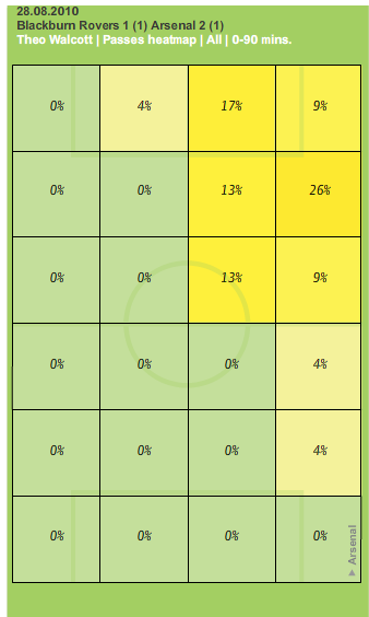 In this way he plays a hybrid role, coming in from the wings, without needing the strength or taking any of the responsibilities of playing through the centre (heatmap vs. Blackburn). The use of a central striker to hold the ball up is crucial for his play, and against Blackburn Walcott linked up fantastically with both Van Persie and notably Chamakh. The 4-3-3 allows him to use his attacking talent high up the pitch making runs across the defence.