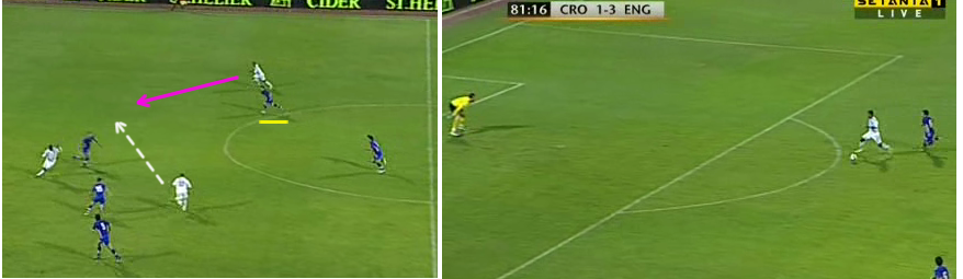 Walcott makes the run on the shoulder of the full back Pranjic (pink) into the space between the full back and centre back against Croatia. The pass (dashed) puts him through one on one to take his hattrick and seal the result for England.