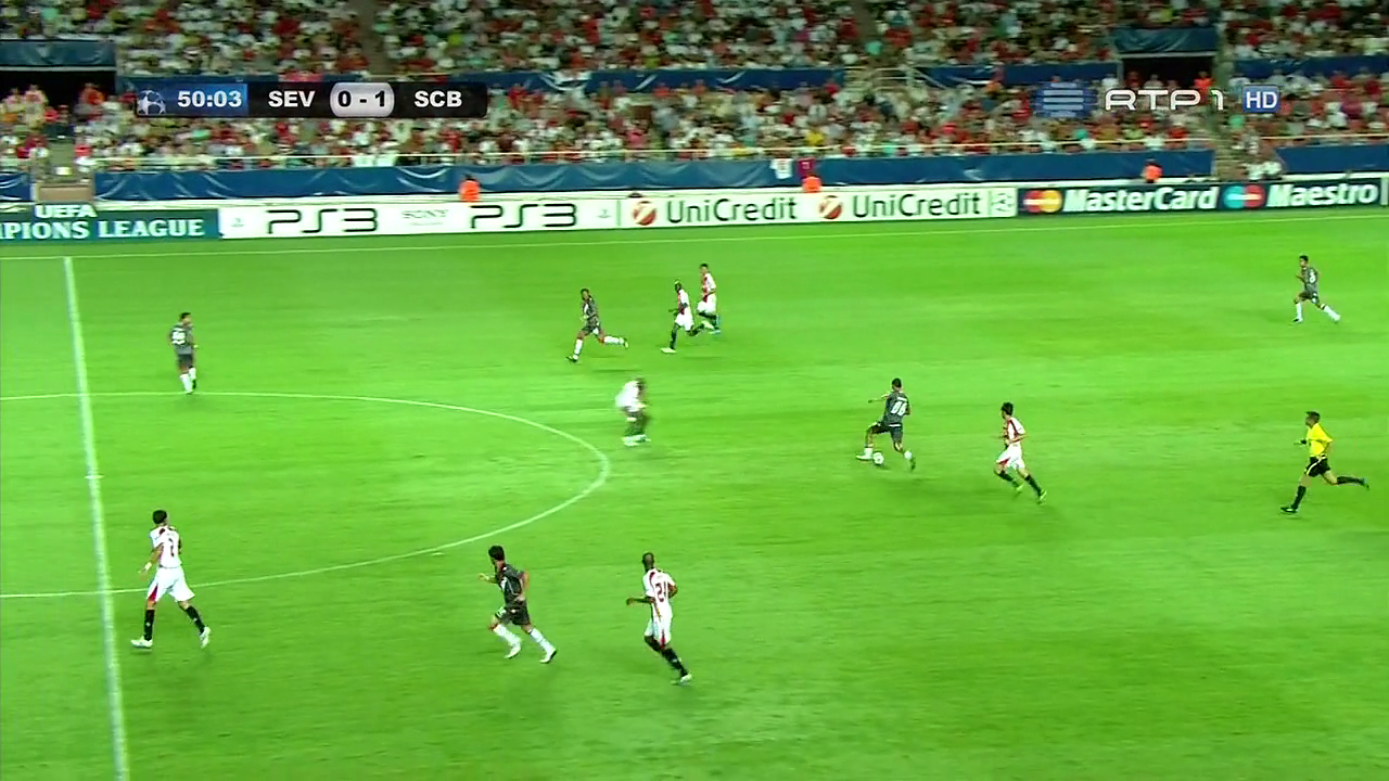 The importance of tracking back – here, in the second leg qualifier against Sevilla, Alan tracked back from his position on the right wing to help the right back pressure the Sevilla player (far left). This is crucial in maintaining stability within the team, and stifling opponents.