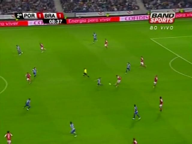 In Liga Sagres Braga are sitting in third place after four games, but on Saturday suffered a draining defeat away to an impressive Porto side. They played in the same pattern as in the Champions League, however the formation was more a 4-4-1-1 than 4-2-3-1 with Aguiar playing behind Lima, and the wingers more withdrawn into line with the ‘doble pivot’ of Vandinho and Salino. Braga used eleven men pressing only within their own half, keeping compact and making it hard for Porto to find a way through.