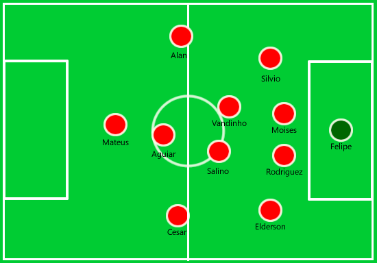 Over 2009-2010 they played a 4-2-3-1 system with a very tight defensive unit, and a ‘doble pivot’ in midfield. This season Vandinho and Salino have started well, and continued the good work as the central midfield pair. Vandinho plays the role of ball winner, whilst Salino sits alongside him.