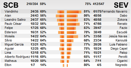Qualifying the poor passing with the statement that it was a defensive away game is justifiable, but it leads me to compare this with the home leg – where you might think that Braga would look to take the advantage – and even here Braga only managed 40% possession. They attempted rather more passes 354, still only completing 59%. Compare this to Sevilla’s stats – 547 attempted passes, completing 412 or 75%.