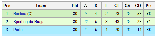 The team really do keep it tight, sitting deep and attempting to hit the opposition on the break, which somewhat reminds me of Aston Villa under Martin O’Neill. The defensive statistics bear this out – last season the team conceded just 20 goals in the league, and scored only 48. By contrast Benfica and Porto, first and third respectively, goals tallies were both in the seventies (see table above).