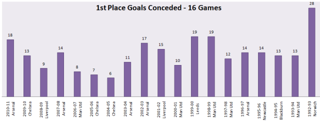 No team has ever won the Premier League conceding over 1.18 goals/game. However the team leading the league after 16 games usually concedes slightly less per game, possibly because defences open up more as the season progresses.
