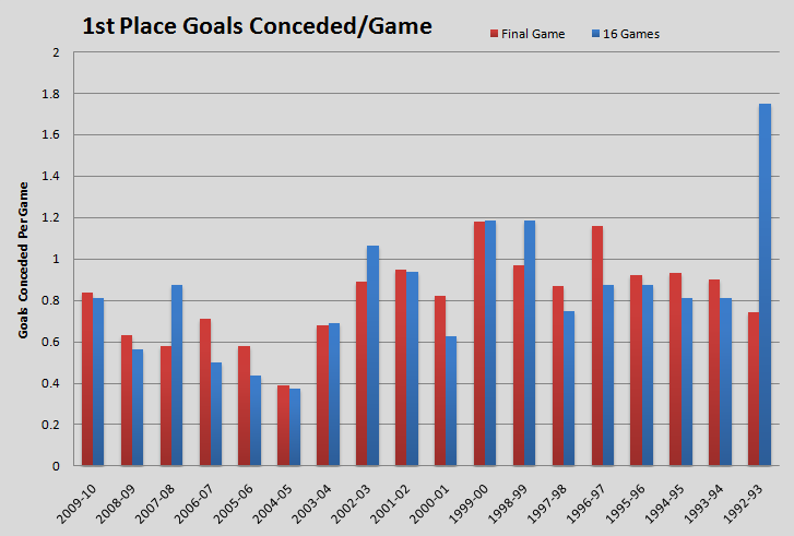 The data comes from the records up to 16 games into the season, solely for goals conceded, and there are some good patterns regarding a reduction in goals conceded by the top side after 16 games until 2004-05, and then a general increase.