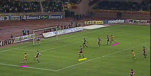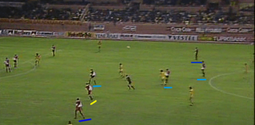 Mark Hateley, the lone striker, was injured after a collision with the Galatasaray keeper late in the first half, and after half time, a rather younger looking Glenn Hoddle donned his knee strapping and took to the field, playing in the hole behind George Weah, who moved to the centre from the right. The formation didn’t change for the second half, Ferratge simply moved to the right wing, which allowed Hoddle to take up his preferred role in the hole.