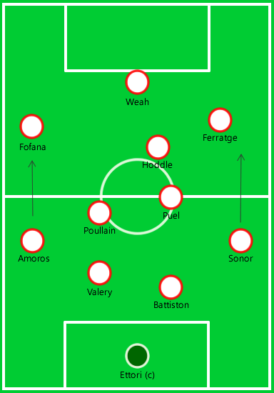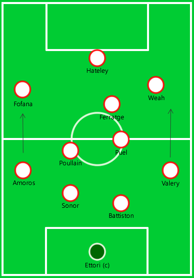 Fofana and Weah were both pacey players utilised on the flanks to different effect. For most of the game Fofana used his pace to attack the left flank, running hard to the by-line, and putting crosses in. Weah in some respects actually played deeper, often trying to dribble the ball forward, cutting inside from deep or playing the ball over the top to the overlapping Valery. Indeed most of the passing triangles and attacking play centred on the right side of the field, where Weah and Ferratge switched position and played passes with Valery the right back, and Puel playing deeper in central midfield.